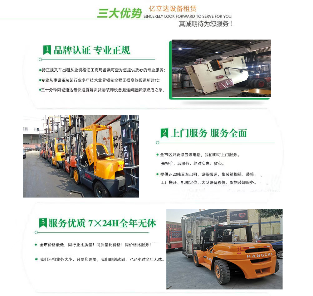亿立达设备租赁有限公司是工商局准许的唐山汉沪区专业叉车出租公司,公司本着诚信、服务、效率、创新的经营理念,用精湛的技术,真诚的服务,为众多客户提供优质的服务,同时获得信赖与支持。专业提供唐山汉沪区3-20吨叉车出租、叉车租赁、设备搬运、集装箱掏箱装箱、机器移位定位、货物装卸、工厂搬迁、安全可靠,收费透明,价格便宜,随叫随到,24小时上门服务!本公司叉车吊车师傅对各种设备搬运装卸都有深刻探讨和研究。很多的疑难设备搬运,通过我公司的叉车师傅都能迎刃而解。对各种进口设备、国产机器、大型设备搬迁、高难度搬迁、各种精密仪器、医疗设备、科研设备等都能搬运; 提供全市 24 小时上门装卸搬运服务。同时提供厂房搬迁服务。 ...